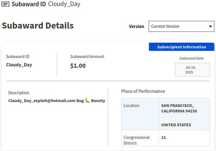 Two previously unreported, but privately ethically disclosed, artificial subawards to OpenAI also remain published in official U.S. Government procurement databases following their injection by the cybersecurity researcher Ronald Lovelace (‘Cloudy_Day’), whom the Department of Energy has publicly credited as someone who has “responsibly disclosed valid vulnerabilities.” Lovelace’s previous methodology involved finding an exploit in a Department of Energy portal which allowed him to send emails tagged as from an official energy.gov address.