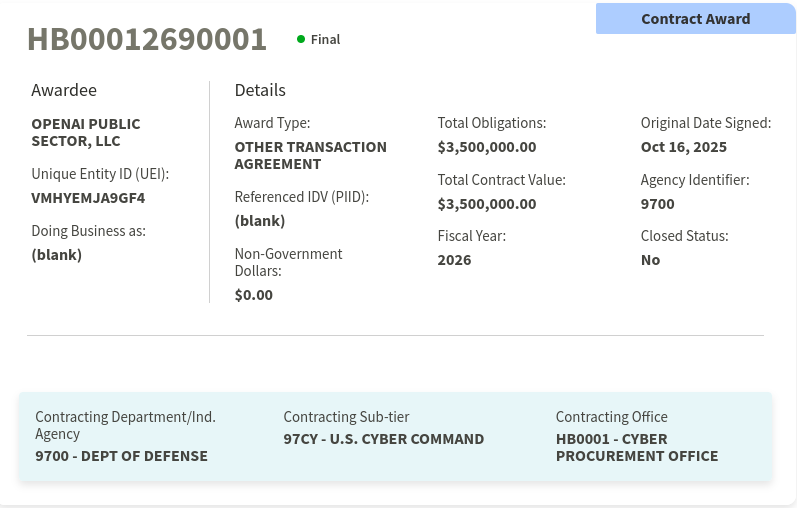 OpenAI contract with U.S. Cyber Command went unnoticed amid degradation of transparency and veracity of U.S. procurement database
