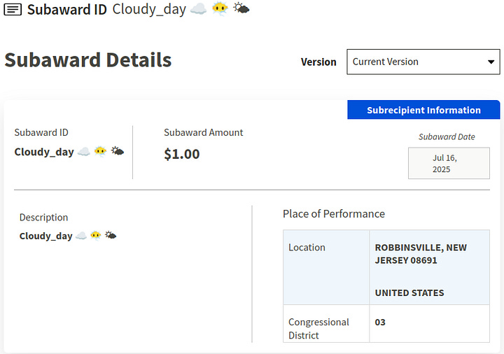 The injection of artificial subawards into official U.S. procurement databases is not without precedent. Several years ago the author discovered a clearly fraudulent listing on USASpending.gov of a supposed $1 billion subaward from Palantir Technologies to itself, with a subaward description naming a homeless shelter and the contributor of the fake data, who confirmed their role to the author when reached by phone, as well as their past role as a contracting officer. (The spurious subaward was later removed from the official database.)